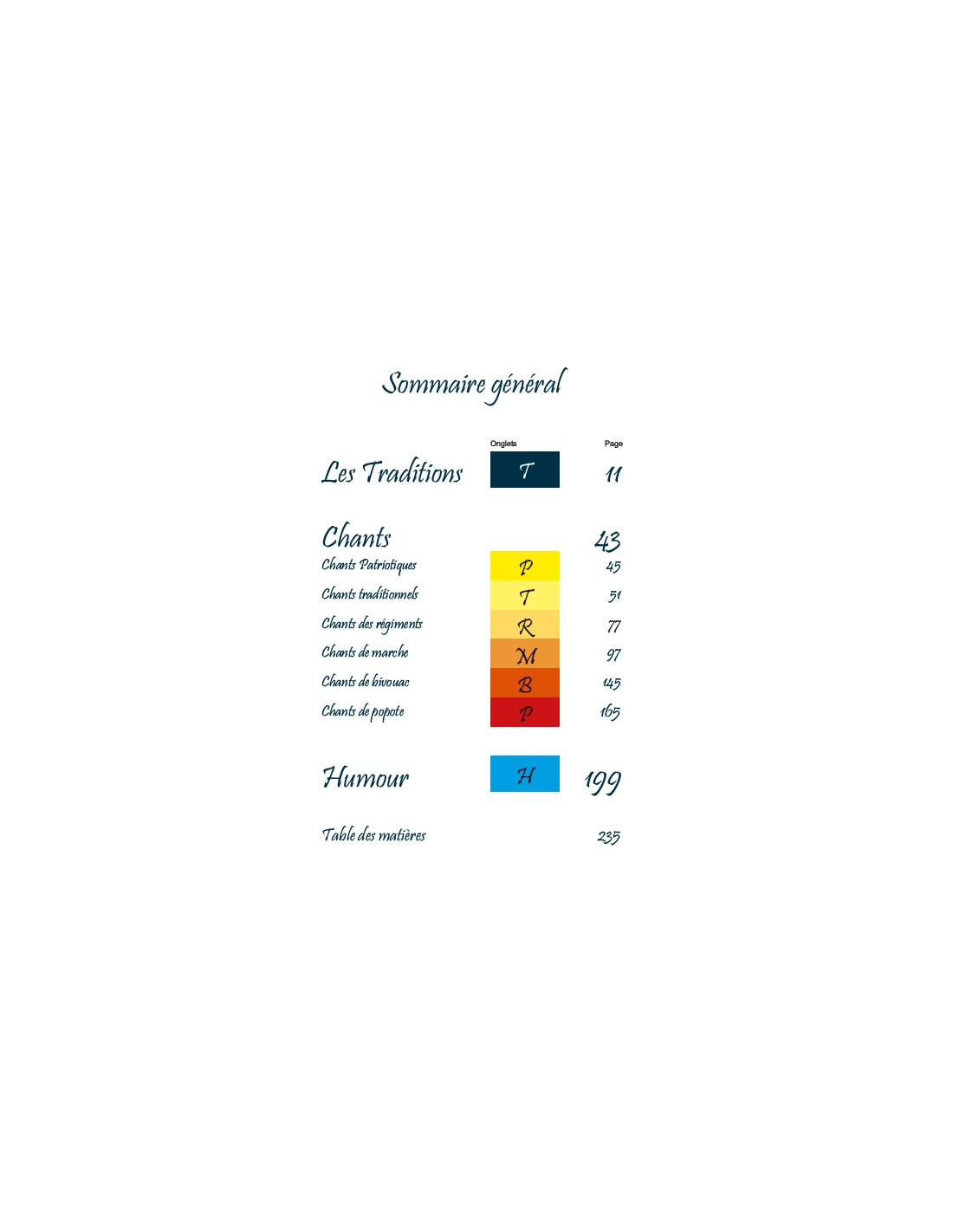 Superbe ouvrage reprenant les Traditions des Troupes de Marine et tous les chants : patriotiques, traditionnels, régiments, marche, bivouac, popote et humour.