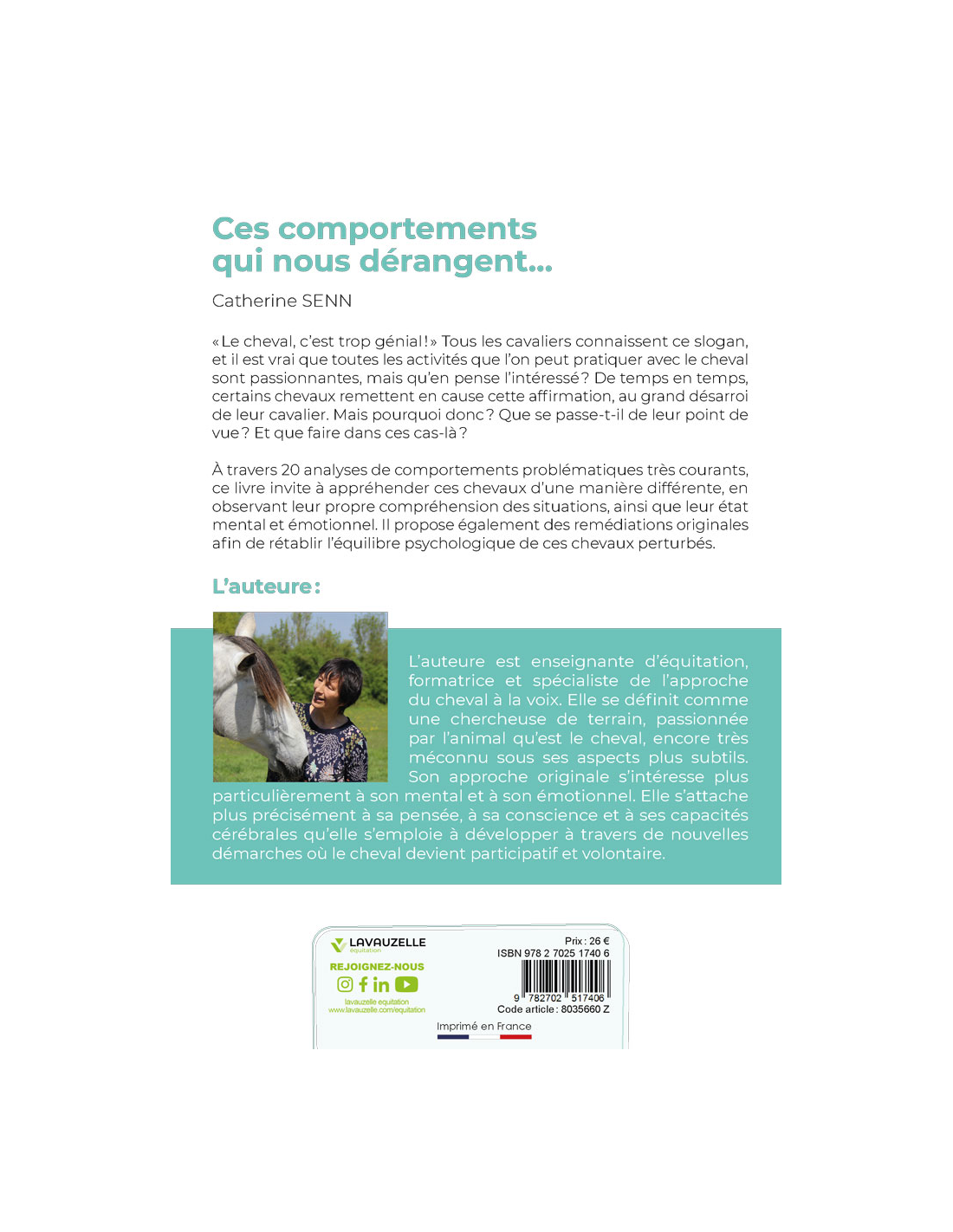 À travers 20 analyses de comportements problématiques très courants, ce livre invite à appréhender ces chevaux d’une manière différente, en observant leur propre compréhension des situations, ainsi que leur état mental et émotionnel. Il propose également des remédiations originales afin de rétablir l’équilibre psychologique de ces chevaux perturbés.