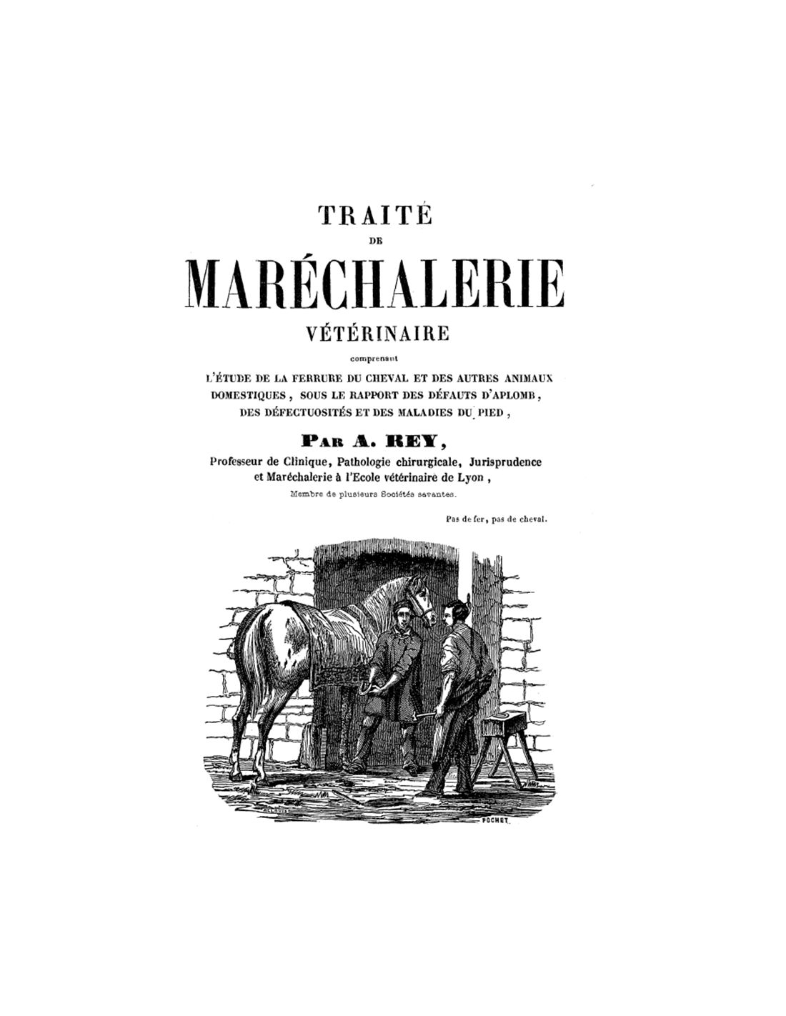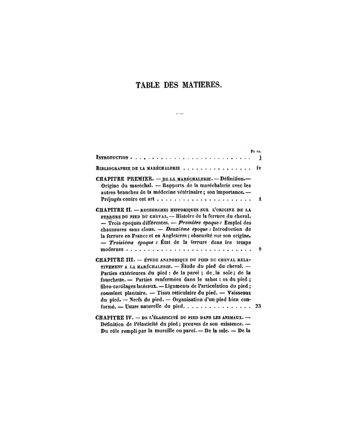 Le traité de maréchalerie vétérinaire comprend l'étude de la ferrure du cheval et des autres animaux domestiques, sous le rapport des défauts d'aplomb, des défectuosités et des maladies du pied.