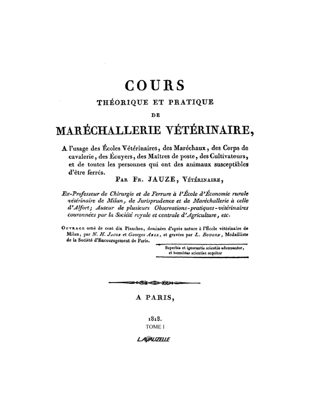 Facsimilé du premier ouvrage de Fr. Jauze, vétérinaire, ex professeur de chirurgie et de ferrure à l'École d'économie rurale vétérinaire de Milan, de jurisprudence et de maréchalerie à celle d'Alfort. Auteur de plusieurs observations pratiques vétérinaires couronnées par la Société royale et centrale d'Agriculture.
